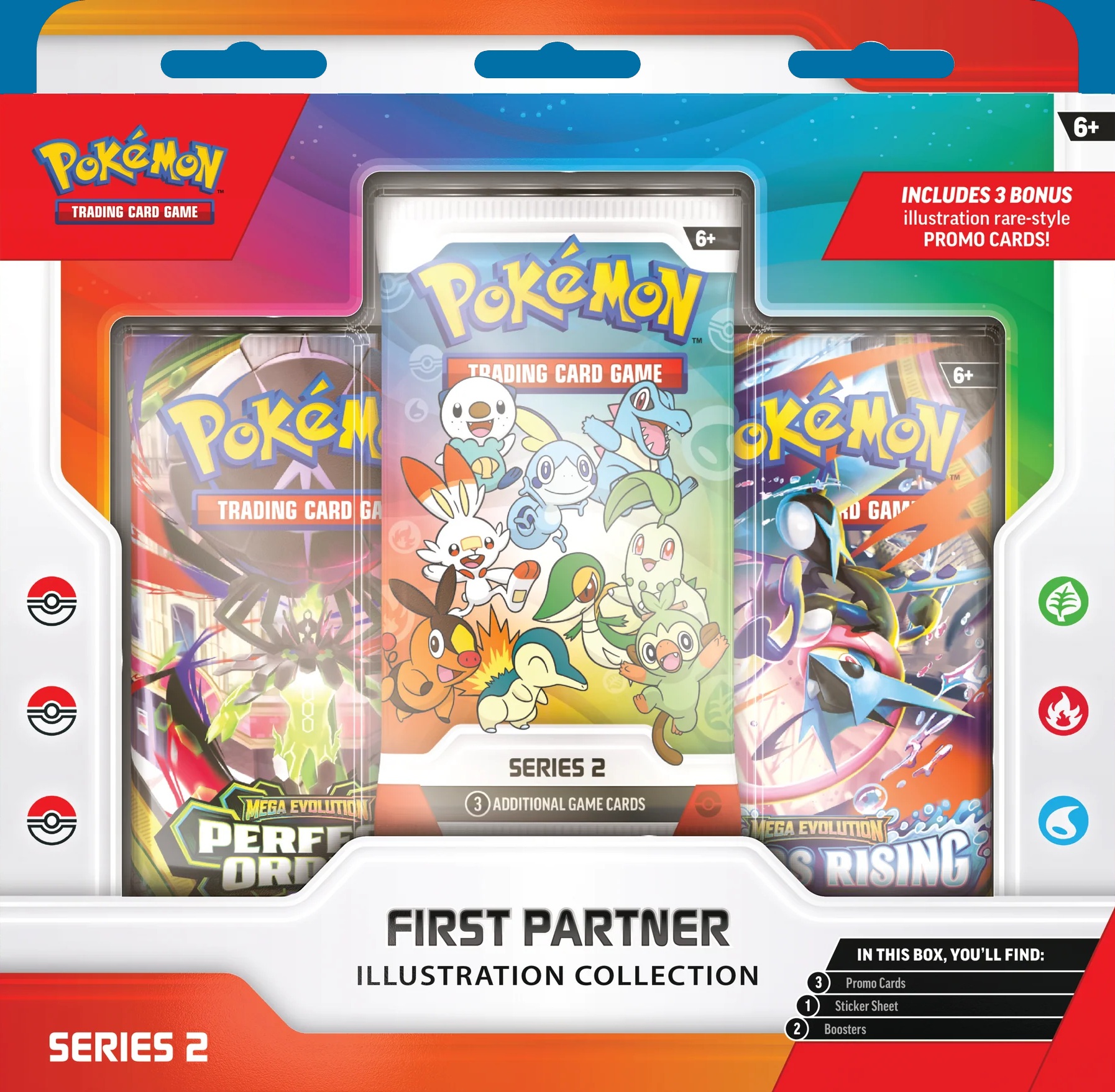 Cada caja trae tres sobres de cartas y una plancha de stickers con los compañeros correspondientes a la Serie en la que estemos. En esta primera edición, los paquetes eran de “Mega Evolution”, “Phantasmal Flames” y el tercero venía con las tres cartas promocionales de los iniciales de alguna de las tres regiones posibles.